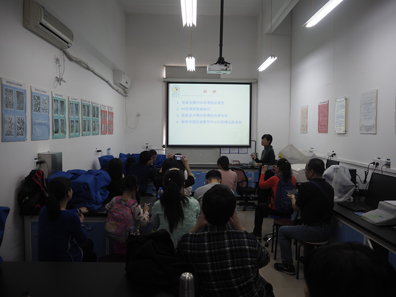 首先,周花老师为来访人员介绍6S管理的基本知识,阐述实验室进行6S管理的必要性,以及实验室如何进行6S管理,并分享我院实验中心6S管理的一些经验和做法。培训结束后,来访者在实验中心工作人员的陪同下,实地参观实验教学中心的试样制备实验室、材料合成实验室、材料加工实验室、材料热处理实验室和材料分析测试实验室等不同类别的实验室。这些实验室为来访者了解如何在各种实验室开展6S管理的提供参考。参观过程中,实验中心工作人员就实施过程中的困难、实施后的成效与来访者进行深入的沟通和交流。来访人员纷纷表示,这次参观学习让他们受益匪浅。